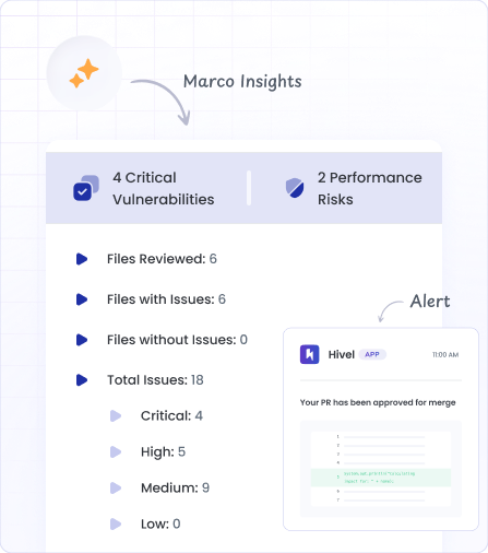 Marco catches bugs, style issues, and security risks the moment you open PRs, so your PRs don't sit unreviewed.