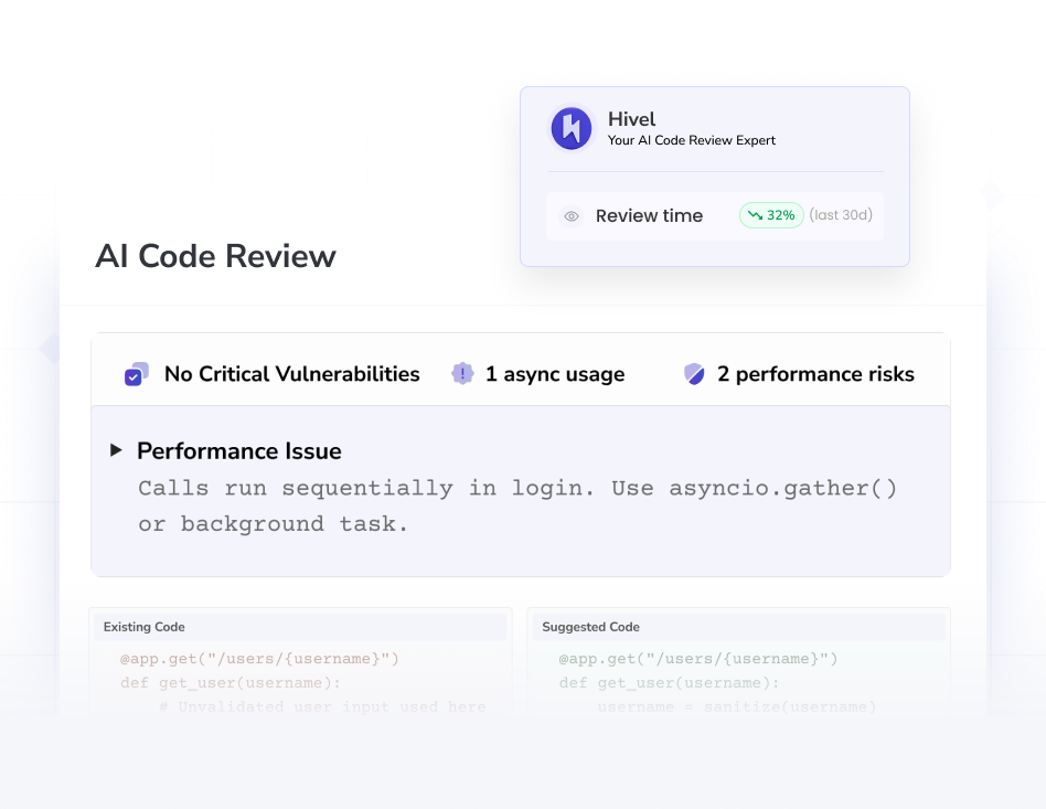 Let AI handle the initial review, automatically flagging risky code, missing tests, and insecure patterns before a human ever steps in.; reduces reviewer fatigue and enforces consistent engineering standards.