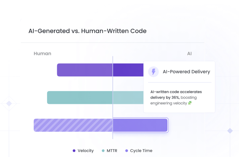 - Correlating AI-assisted commits with engineering outcomes: We can see how AI impacts key metrics like cycle time, change failure rate, defect density, rework, and deployment stability. We can also compare the performance of a team using AI vs a team not using AI.