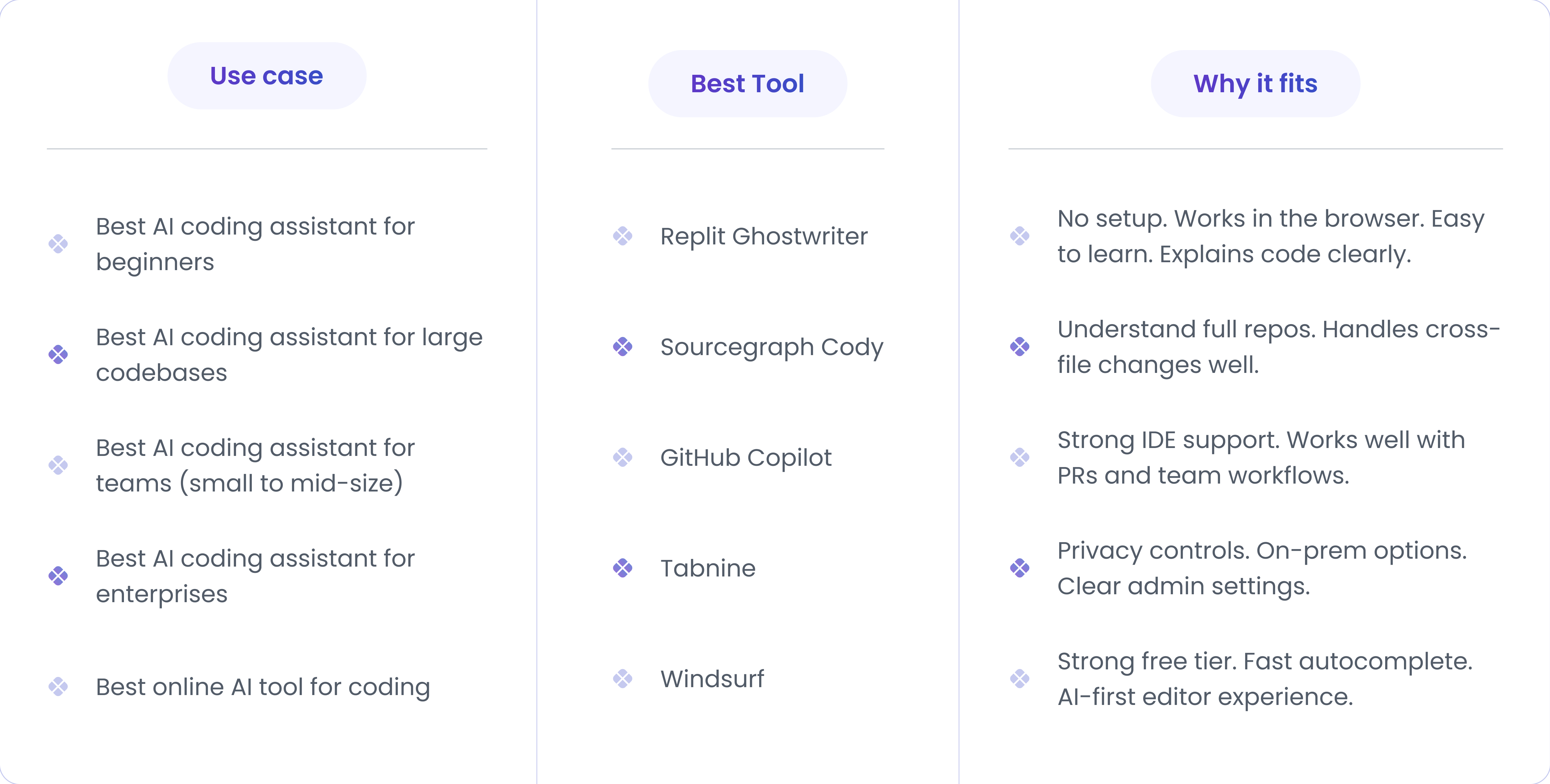 There is no single best tool for everyone. The right choice depends on your engineering workflow, team size, codebase, and budget. Some tools work better for large enterprise teams, while some tools work better for fast individual work. You can select from our handpicked 8 best AI coding tools - GitHub Copilot, Amazon CodeWhisperer, Sourcegraph Cody, Tabnine, Replit Ghostwriter, Windsurf (formerly Codeium), Cursor, and JetBrains AI Assistant.