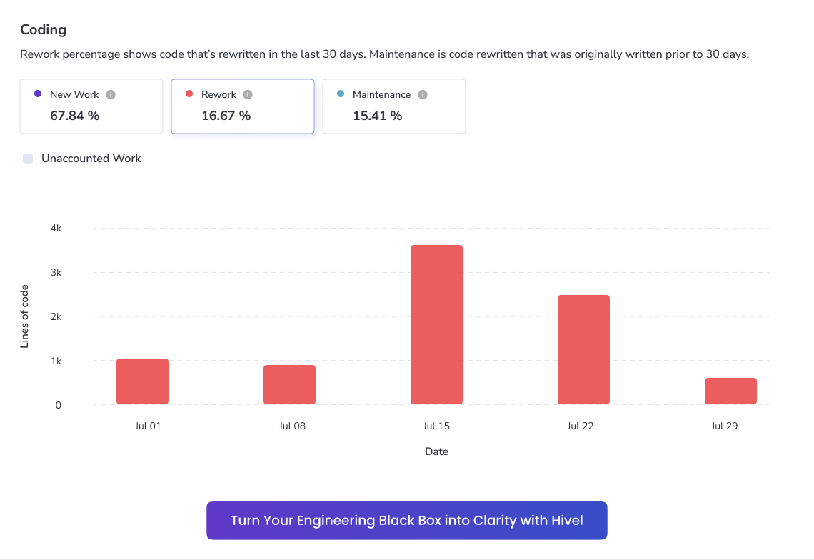 Smart Code Work Classification: Hivel breaks down your code changes into New Work (fresh code), Rework (fixes or changes to code written in the last 30 days), and Maintenance (refactors, dependency bumps, and general housekeeping done after 30 days). This clarity helps engineering leaders spot imbalances fast.
