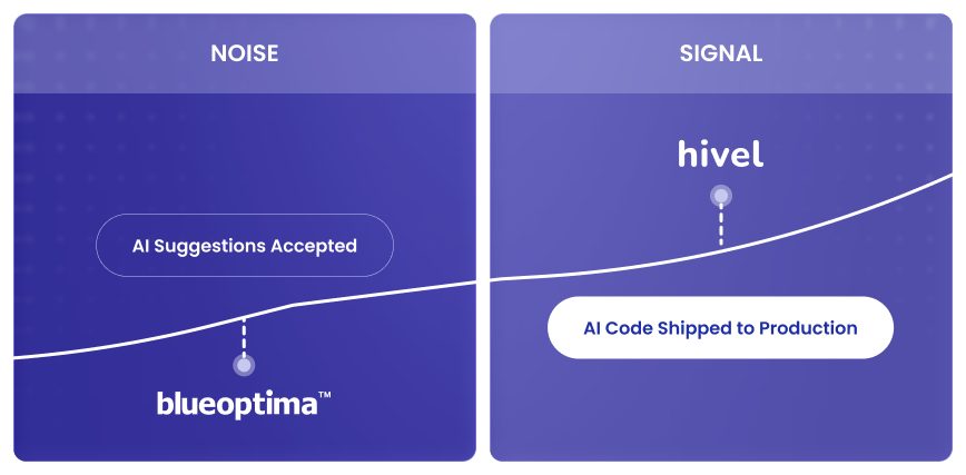 Hivel measures AI-generated code that survives review and reaches production. BlueOptima relies on surveys and surface signals, which are outdated and cannot confirm how much AI code actually ships.