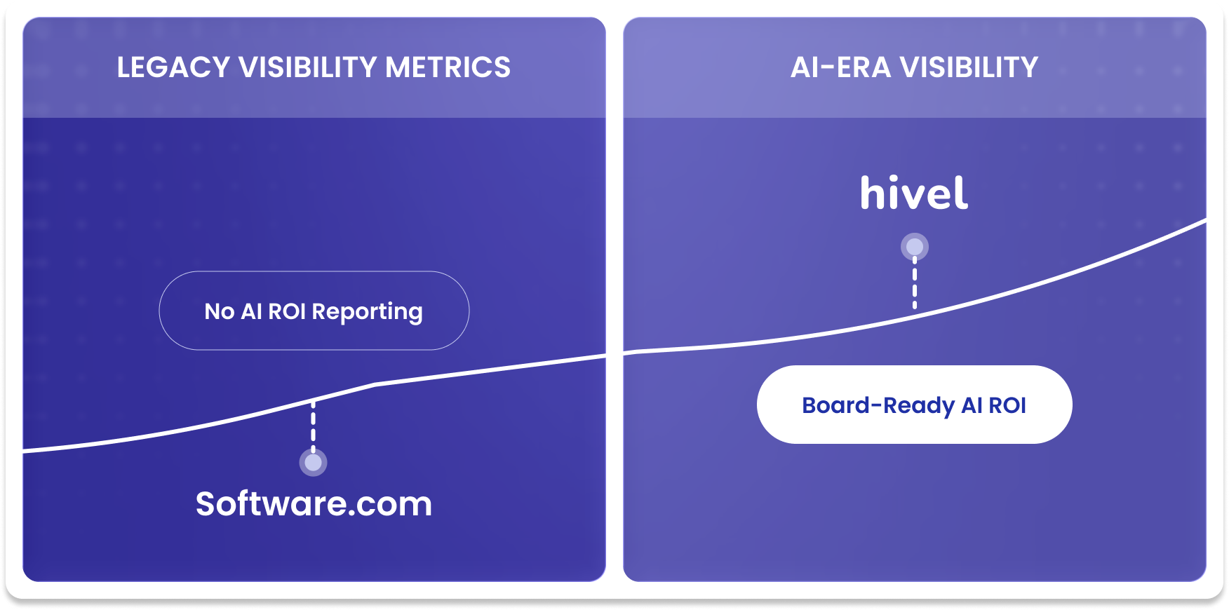 Hivel tracks AI-generated code that reaches production, measuring real-world impact on cycle time and quality, unlike Software.com, which only tracks AI tool usage without correlating it to business outcomes.