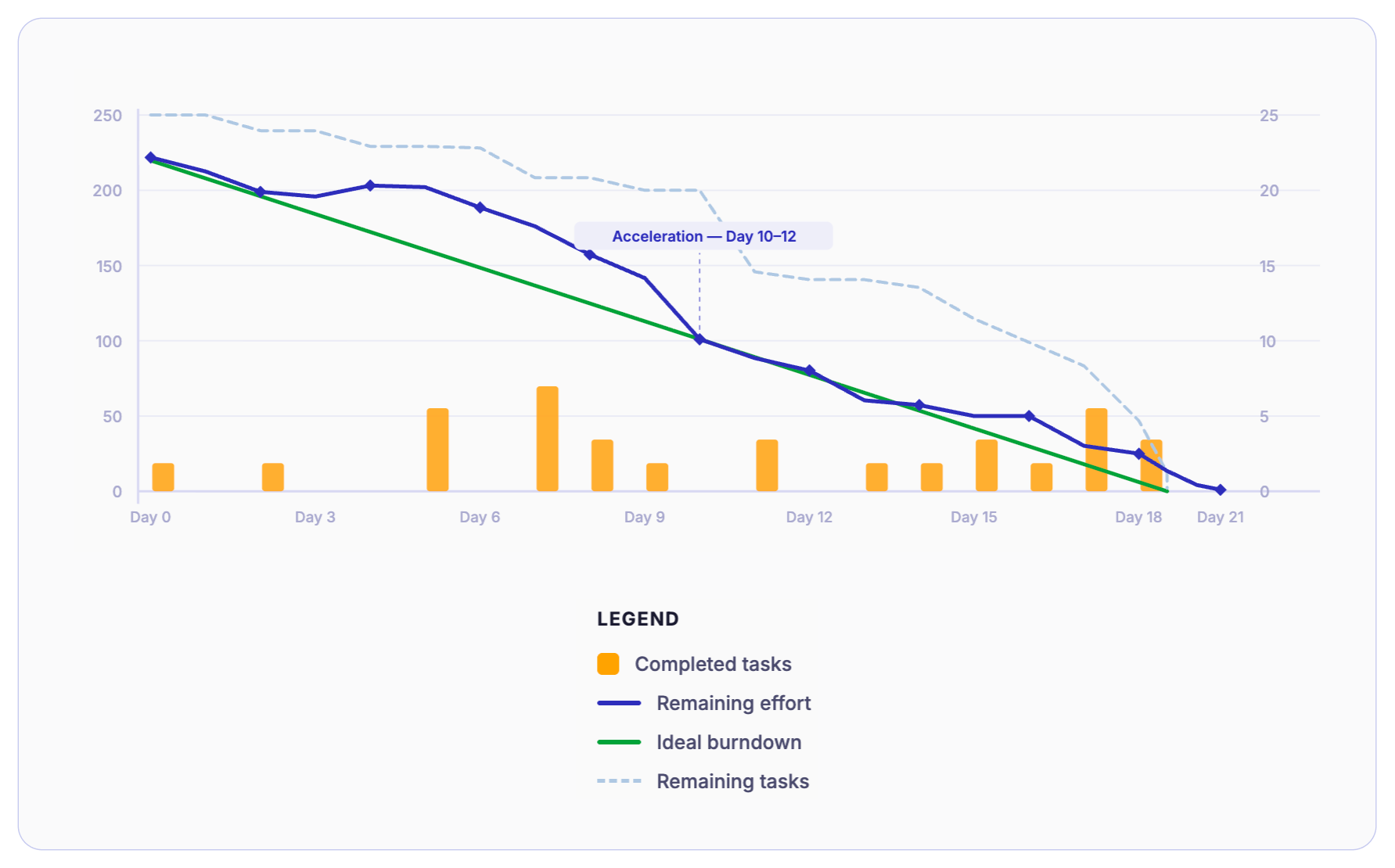 The burndown chart has earned its place in the Agile delivery model across engineering teams. It is simple, accessible, and when read with discipline, it shows real signals about how a sprint is unfolding. For teams running two-week cycles, it remains one of the fastest ways to identify execution risk before they miss the commitment.