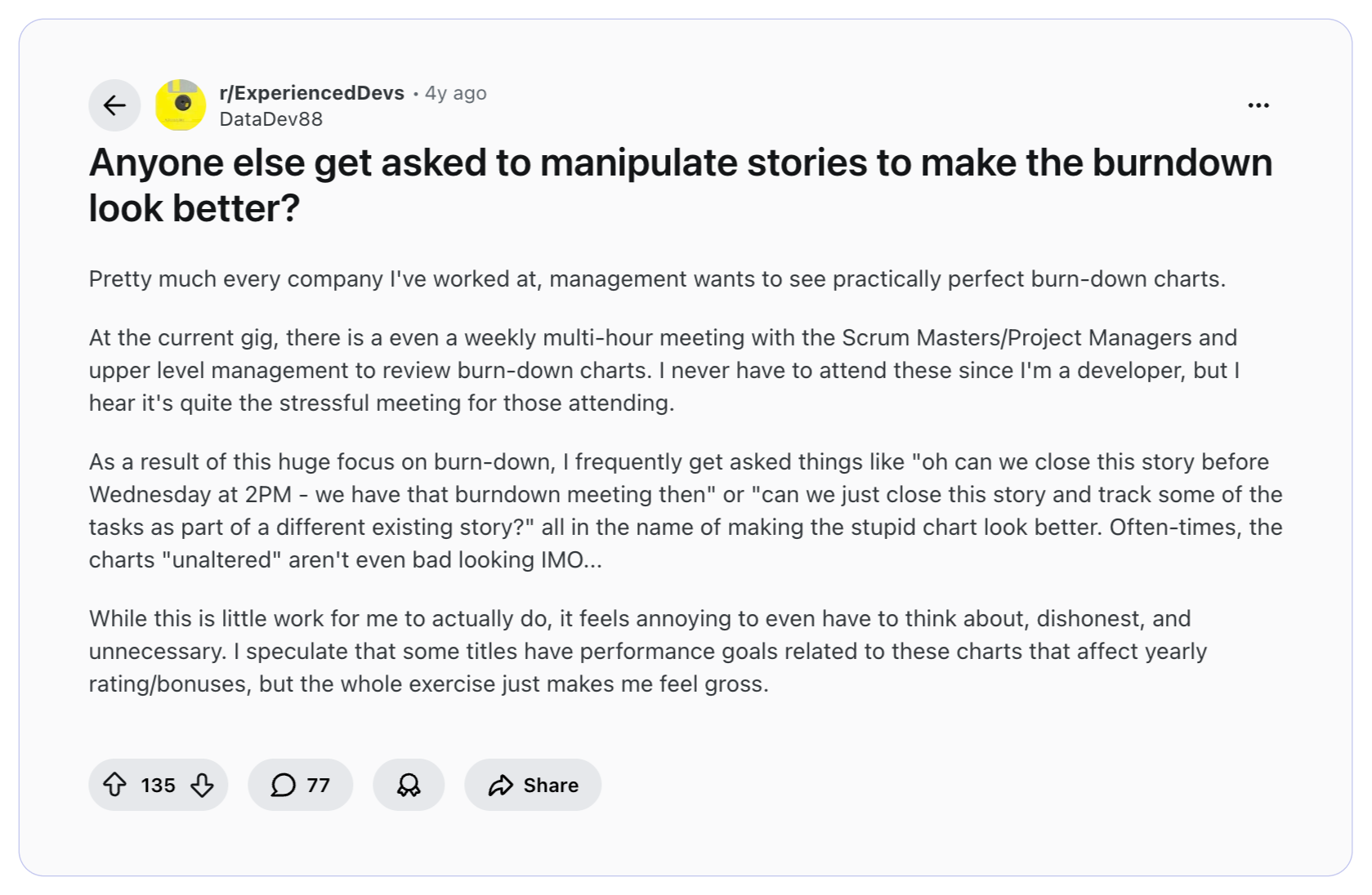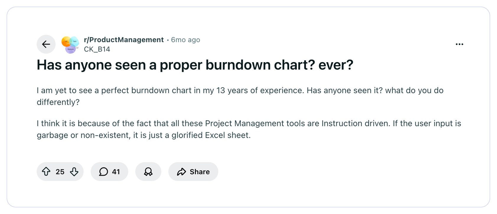 In this Reddit thread, the Redditor asked a burning question - Has anyone seen a proper burndown chart? Ever? What he elaborated further was the clean reality. He said, project management tools are instruction-driven. If the user input is garbage or non-existent, it is just a glorified Excel sheet.