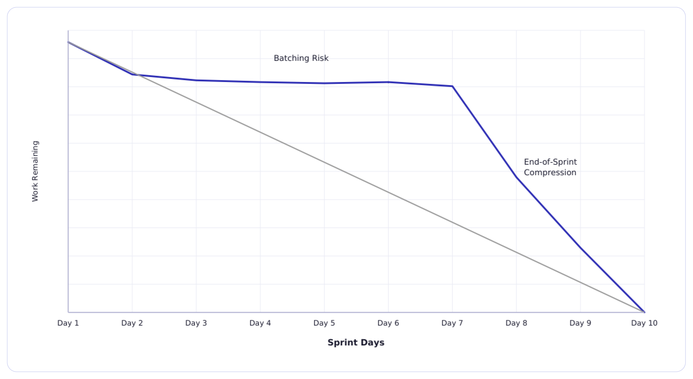 This is one of the most common and least discussed patterns in sprint execution. Stories sit in review, in testing, or near-done status for most of the sprint time. And then suddenly, 24-48 hours before the sprint nearing the end, everything gets marked done. So, when any leader sees a burndown chart, the chart tells them that the sprint looks successful. But the underlying reality of the team compressing all their integration, review, and verification work into the final stretch never gets surfaced. The chart recorded completion. It did not record risk.