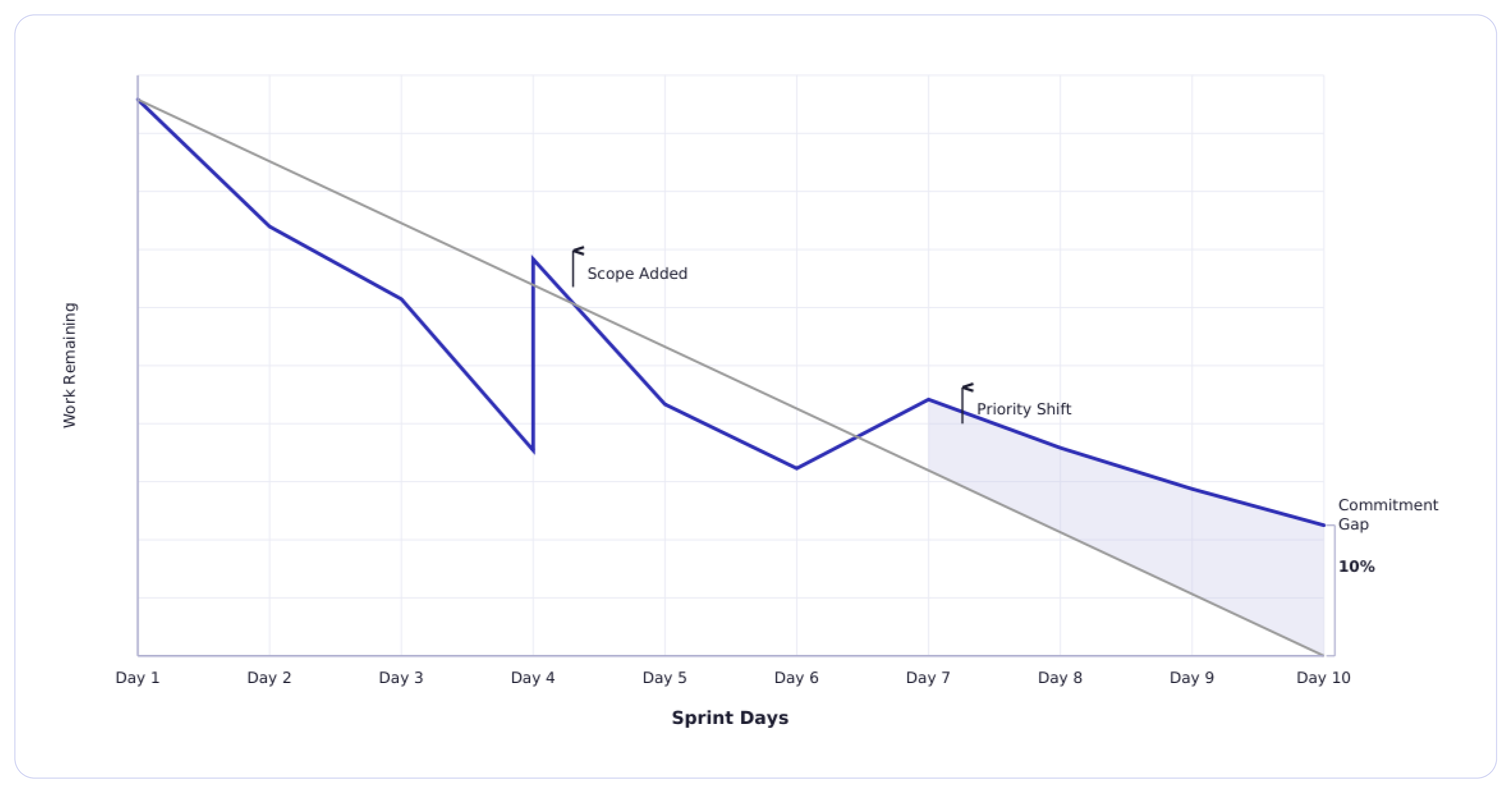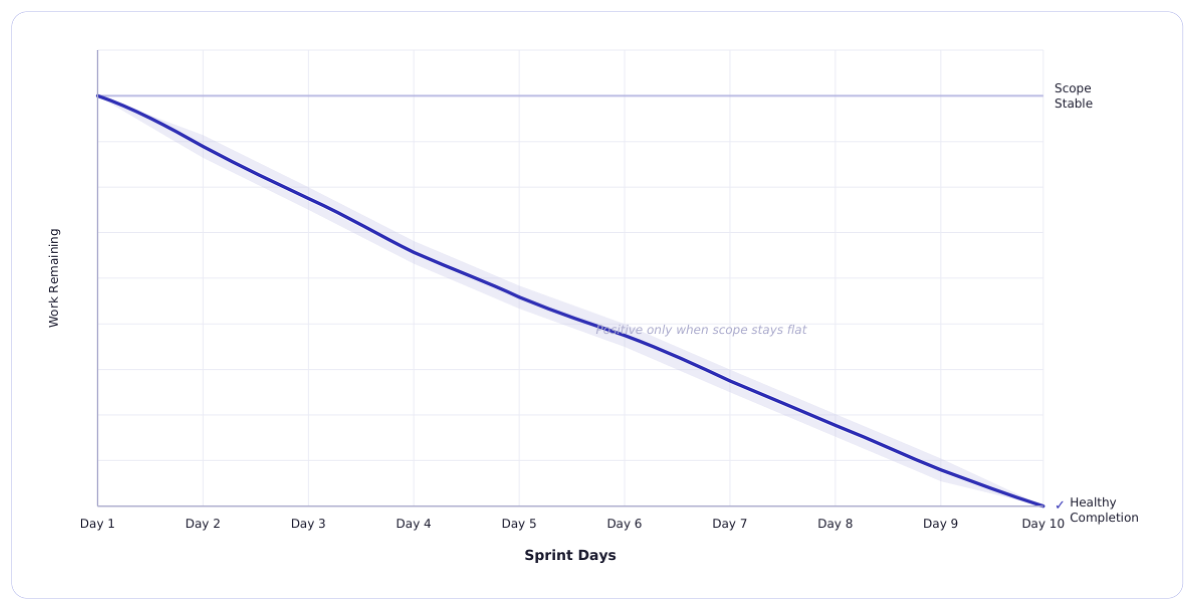 The burndown line should always run downward. If the line goes up during the sprint, that means new work was added. That’s a scope increase. Occasional adjustment is normal. But frequent spikes create ripples across the engineering pipeline.