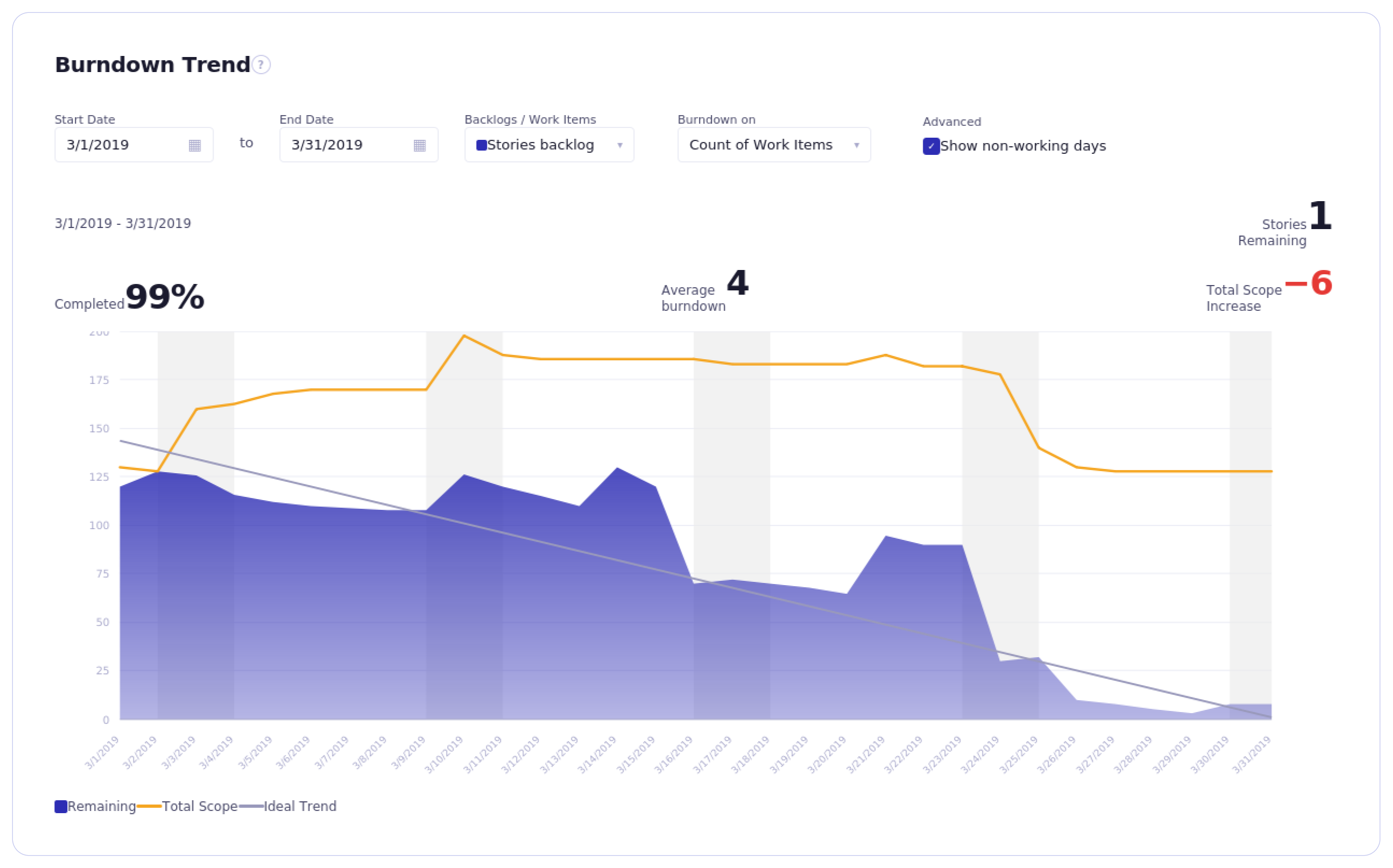 Using a burndown chart, leaders can easily spot completion behavior patterns very clearly and make necessary process upgrades.