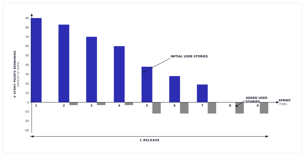 Roadmap predictability: Release burndown chart gives product and leadership a view into whether the release is trending toward its target date. If the scope keeps getting added and the line is not moving fast enough, the release date is at risk.