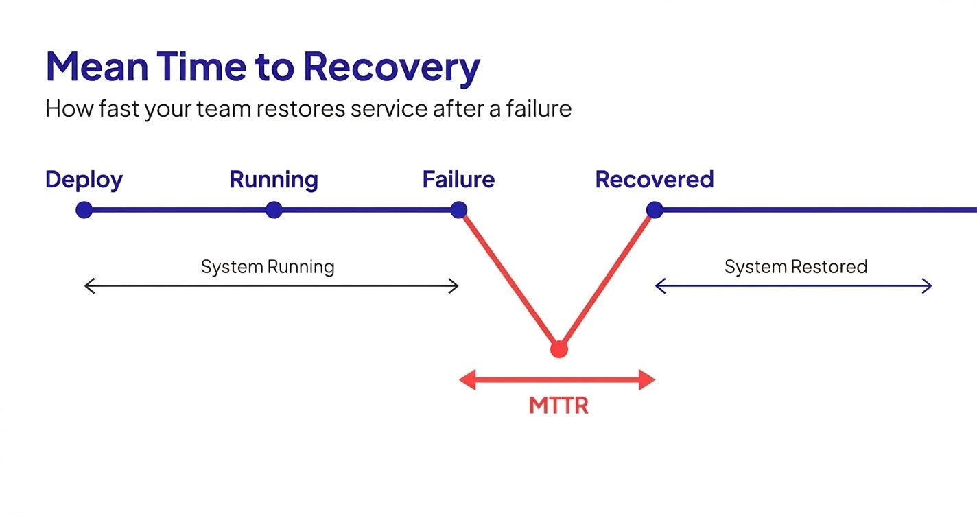 This metric focuses on release stability. Even if a team deploys frequently, a high failure rate means the system is fragile and risky.