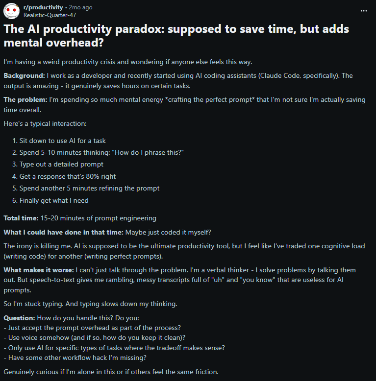 However, several developers acknowledge that AI is infusing artificial productivity gain by making them feel productive for the time being. In this Reddit thread, one developer shares his frustration with the idea of being productive by using AI.