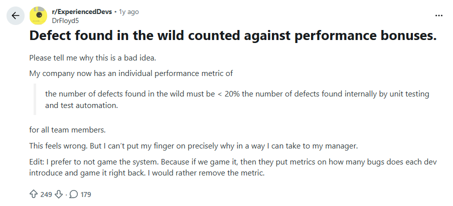 And this is pretty much evident in software development. In one of the Reddit threads, they discussed how iIncentives tied to metrics cause metric gaming! Developers argued that when bonuses depend on defect metrics, teams start hiding or gaming bugs just to protect their numbers.