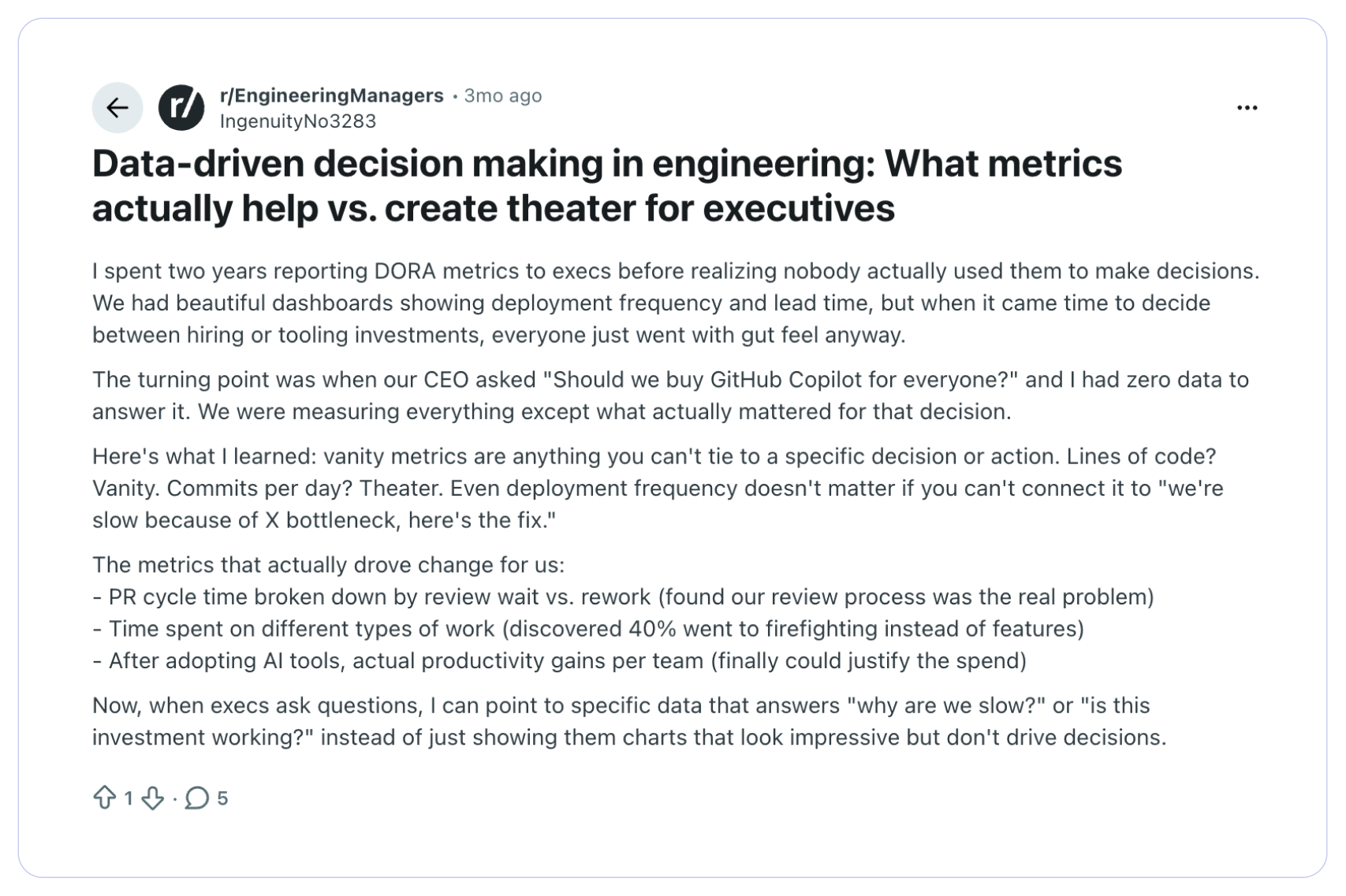 In this Reddit thread, a Redditor makes a very thought-provoking point. He says, “Vanity metrics are anything you can't tie to a specific decision or action. Lines of code? Vanity. Even deployment frequency doesn't matter if you can't connect it to 'we're slow because of X bottleneck.”