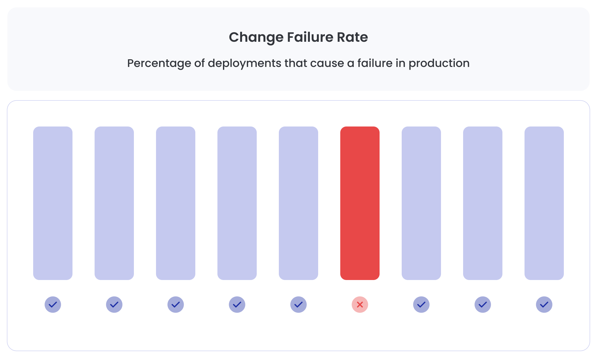 This metric focuses on release stability. Even if a team deploys frequently, a high failure rate means the system is fragile and risky.